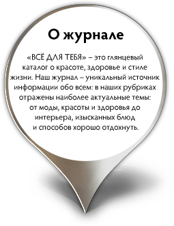«ВСЁ ДЛЯ ТЕБЯ» – это глянцевый каталог о красоте, здоровье и стиле жизни. Наш журнал – уникальный источник информации обо всем - от моды, красоты и здоровья до интерьера, изысканных блюд и способов хорошо отдохнуть. Мы предлагаем только качественные товары и услуги, поскольку работаем для компетентного и искушенного читателя.