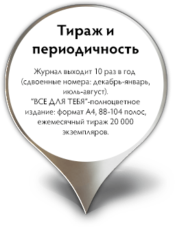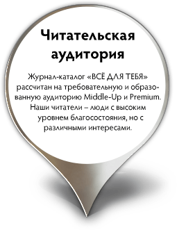 «ВСЁ ДЛЯ ТЕБЯ» рассчитан на требовательную и образованную аудиторию Middle-Up и Premium. Уникальная система распространения журнала гарантирует прямое попадание в целевую аудиторию.
